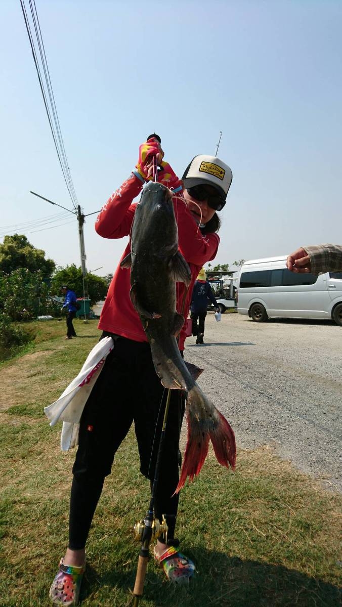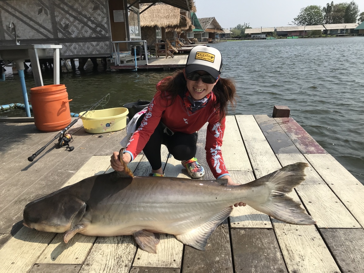同行者がチャオプラヤキャットフィッシュを釣り上げると、女将もヒット!トルクのある魚との、やり取りの結果、釣り上げたのは、アジアンレッドテールキャット!初魚種に女将も大興奮でした。