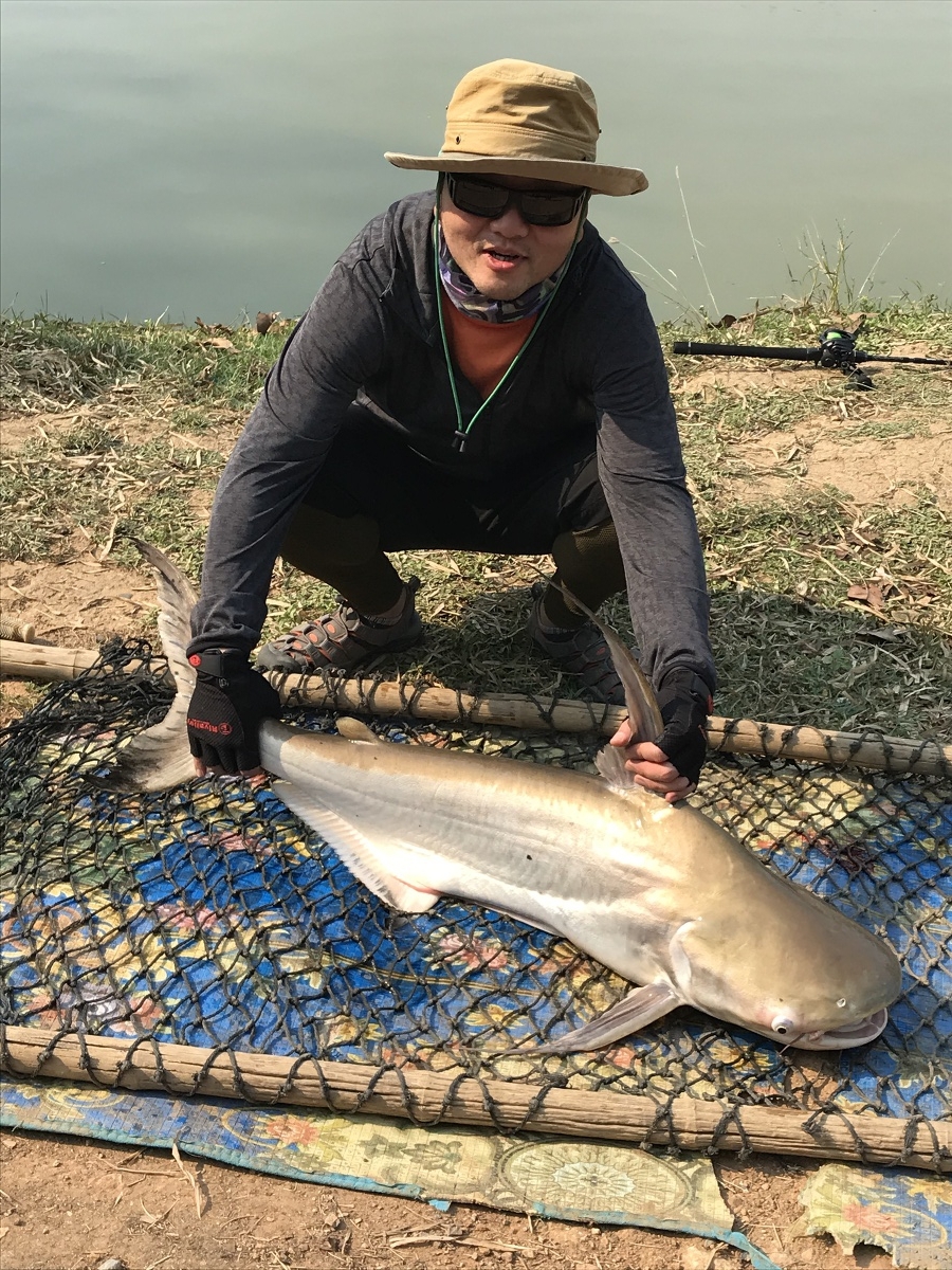 いよいよ2回目のエサ撒きタイムに突入すると同行者に早速ヒット!これも強烈な引きが対岸からも伺える。落ち着いたやり取りで釣りあげられたのは、グッドサイズのチャオプラヤキャットフィッシュ!確かに引きますわ・・・