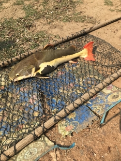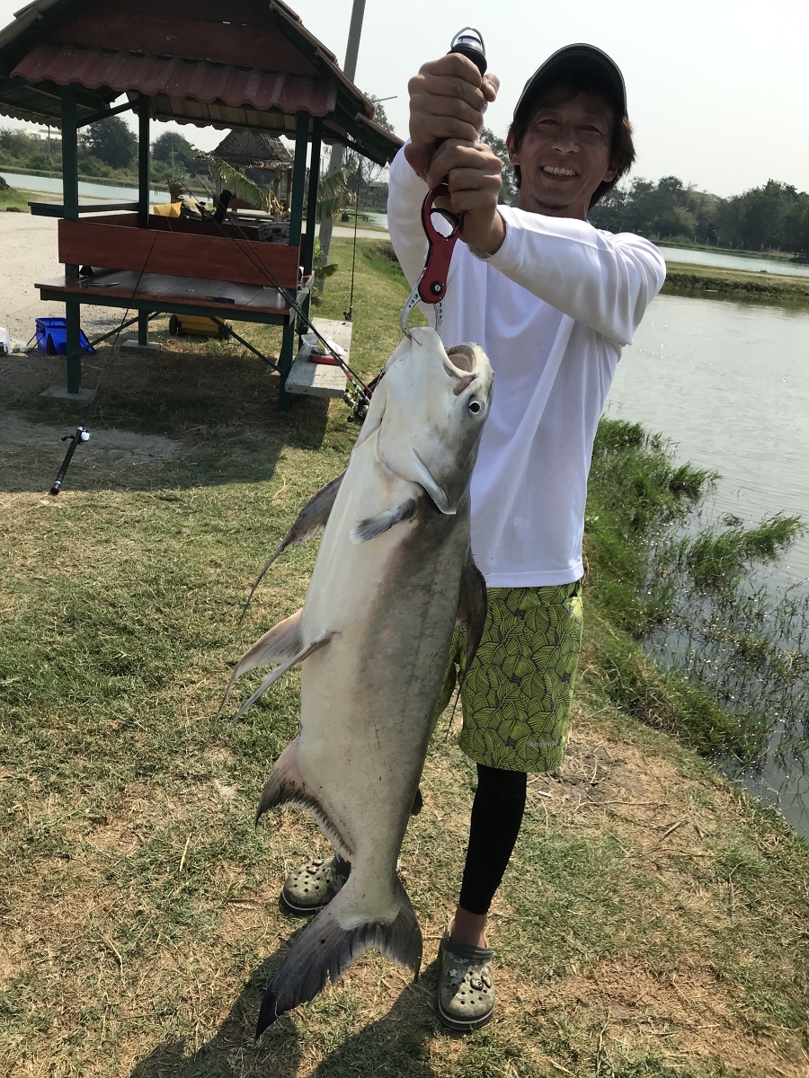 そのタイミングでヒットさせる事ができ、グイグイとトルクのある引き、上がってきたのは、チャオプラヤキャットフィッシュでした。同行者も同じ魚種を釣り上げていました。