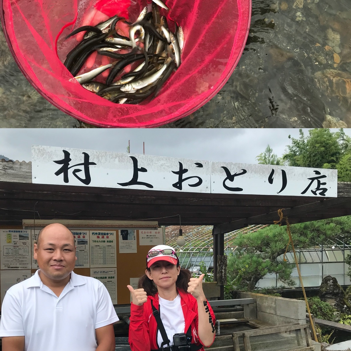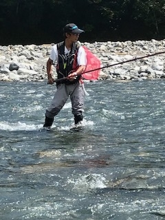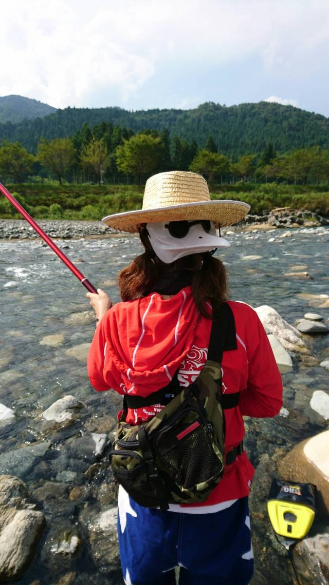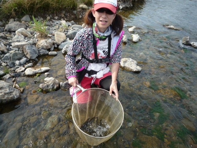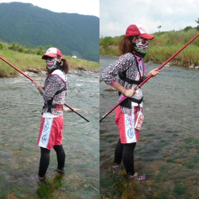 女将、おススメライト鮎釣り。 こんなスタイルでもできちゃう! 足は水に浸かるから暑さ半減! 来年はご一緒にいかが?? |