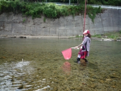 先日の大雨でコケがまだついてなく、前回よりも難攻しました。 鮎が小さく上桂川みたいに引きづるとすぐにバレてしまうので、 一気にキャッチを試みました。 ら・・・らバラしまくりました。 |